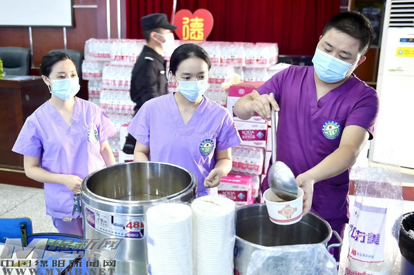 綠豆湯送給醫(yī)護(hù)人員(綿陽(yáng)日?qǐng)?bào)社融媒體記者王勇攝)