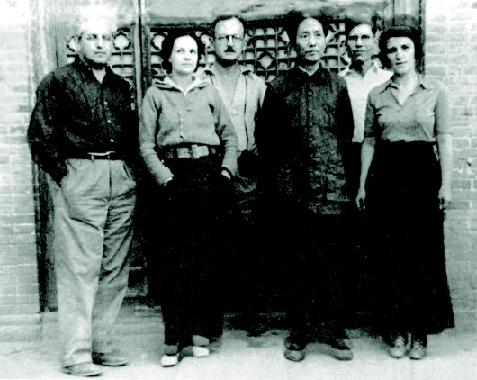 1937年,托馬斯·亞瑟·畢森和朋友們到訪延安,左起為菲立浦·賈菲、佩吉·斯諾(尼姆·威爾斯)、歐文·拉鐵摩爾、毛澤東、畢森、艾格尼絲·賈菲。