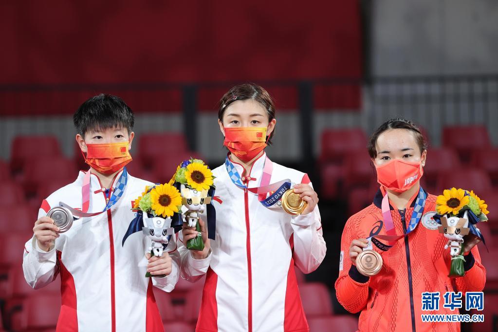 7月29日,冠軍中國(guó)選手陳夢(mèng)(中),亞軍中國(guó)選手孫穎莎(左)和季軍日本選手伊藤美誠(chéng)在頒獎(jiǎng)典禮上。