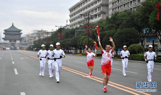 8月16日,火炬手楊建科(右二)和何沛(左二)在火炬?zhèn)鬟f中。