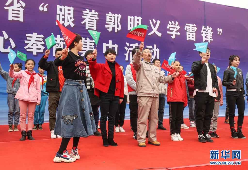 2019年3月5日,在遼寧省葫蘆島市文化廣場舉行的遼寧省“跟著郭明義學雷鋒”愛心奉獻集中活動現(xiàn)場,郭明義(前排中)與志愿者合唱《學習雷鋒好榜樣》歌曲。新華社記者 潘昱龍 攝