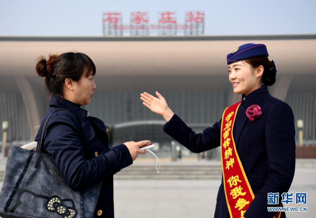 2019年3月5日,在石家莊站廣場,中國鐵路北京局集團有限公司京鐵列服公司石家莊分公司高鐵餐吧部的工作人員引導一名旅客前往候車位置。新華社記者 王曉 攝