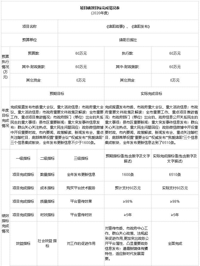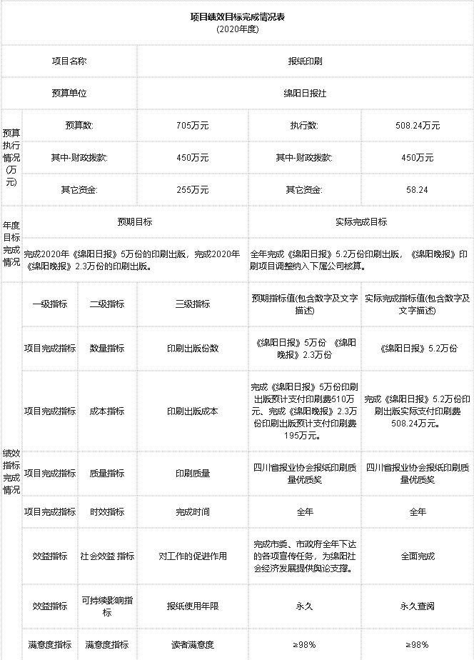2020年部門對(duì)“報(bào)紙印刷”、“報(bào)紙發(fā)行”、“《綿陽政事》《綿陽發(fā)布》工作經(jīng)費(fèi)”等項(xiàng)目進(jìn)行了績效自評(píng),將評(píng)價(jià)結(jié)果應(yīng)用到次年的項(xiàng)目預(yù)算申報(bào)及項(xiàng)目績效管理中,從運(yùn)行成本、管理效率等方面,衡量報(bào)社核心項(xiàng)目的實(shí)施效果。并按規(guī)定時(shí)限在門戶網(wǎng)站及時(shí)公開了項(xiàng)目支出績效自評(píng)報(bào)告。