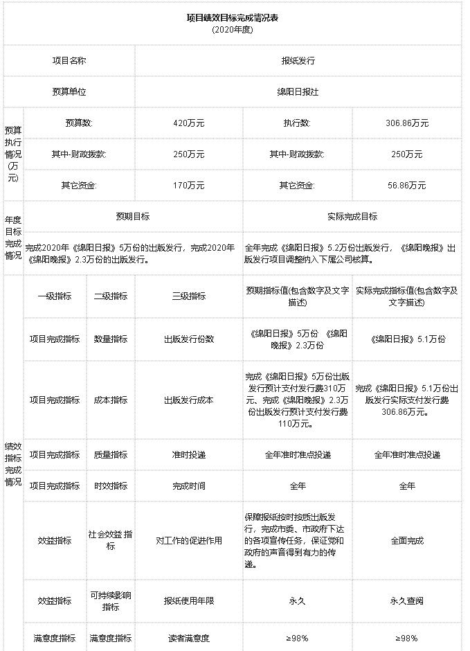 項(xiàng)目完成指標(biāo):截止2020年12月31日保質(zhì)保量按時(shí)完成了《綿陽日?qǐng)?bào)》2020年5.1萬份的報(bào)紙發(fā)行任務(wù)。