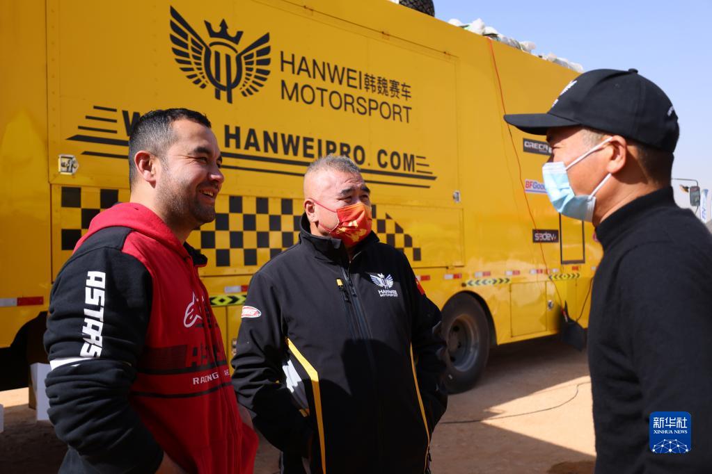 1月8日,摩托車(chē)組中國(guó)車(chē)手扎克爾·牙克甫(左)、汽車(chē)組中國(guó)車(chē)手田坡(中)、韓魏在利雅得營(yíng)地交流比賽心得。