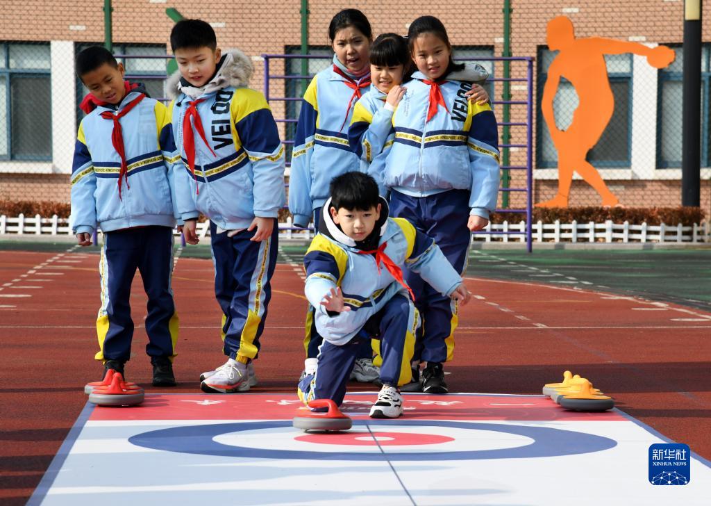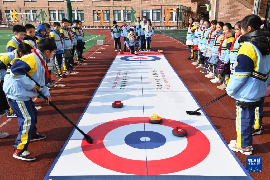 1月11日,青島市基隆路小學(xué)的同學(xué)們在體育課上練習(xí)旱地冰壺。
