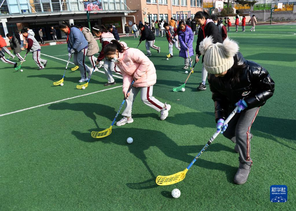 1月11日,青島市基隆路小學(xué)的同學(xué)們在體育課上練習(xí)旱地冰球。