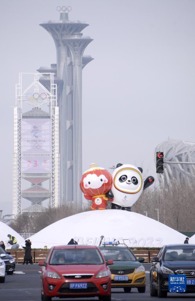 約7.5米高的北京2022年冬奧會(huì)和冬殘奧會(huì)吉祥物“冰墩墩”“雪容融”日前在位于北京中軸線的奧林匹克景觀大道南端亮相。“冰墩墩”和“雪容融”可愛(ài)的造型吸引了路人的目光。