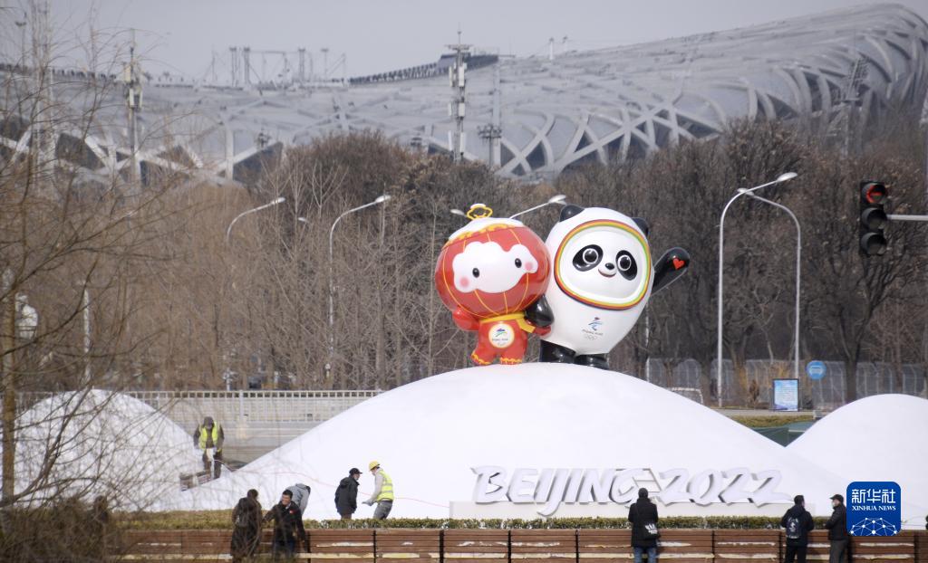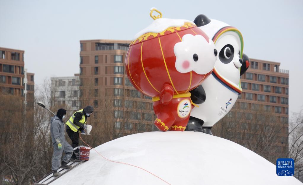 這是1月12日拍攝的即將完工的“冰墩墩”和“雪容融”景觀。