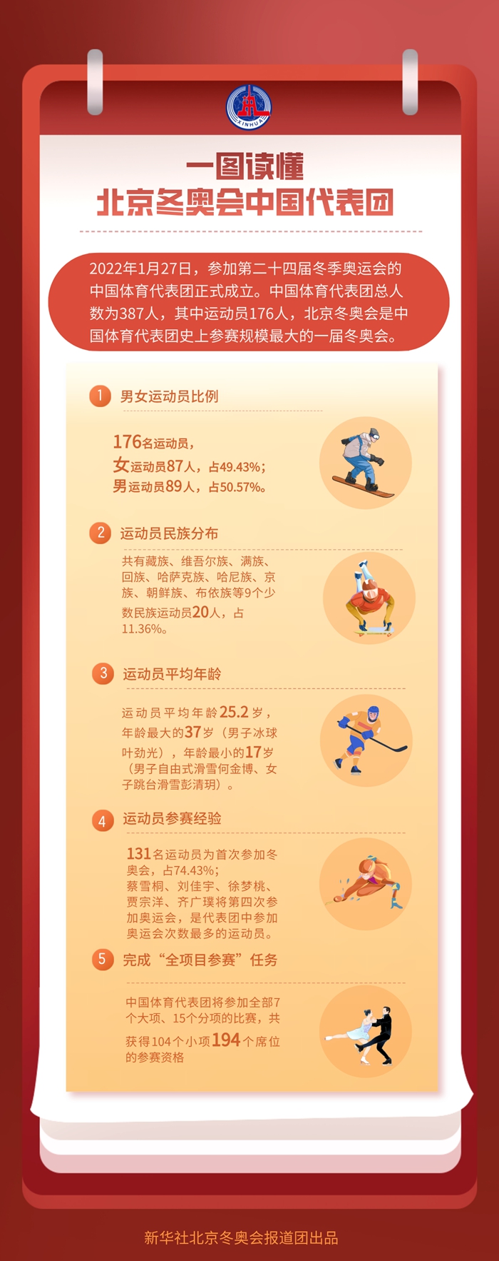 北京冬奧會中國體育代表團總?cè)藬?shù)為387人,其中運動員176人,教練員、領(lǐng)隊、科醫(yī)人員等運動隊工作人員164人,團部工作人員47人。北京冬奧會是中國體育代表團歷史上參賽規(guī)模最大的一屆冬奧會。