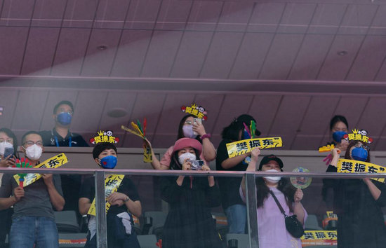 10月8日,現(xiàn)場觀眾為中國隊選手樊振東加油助威。新華社記者 江宏景 攝
