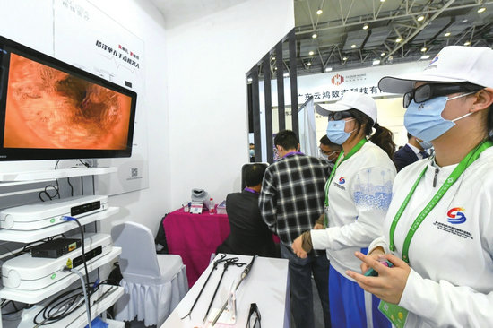 第十屆科博會上,志愿者佩戴特殊眼鏡觀看3D電子內窺鏡屏幕(新華社記者 唐文豪 攝)