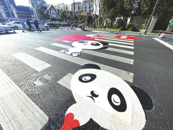 據(jù)介紹,設(shè)計創(chuàng)意斑馬線是因為此處校園比較集中,有兩處幼兒園和一所中小學(xué),以“熊貓抱紅心”為主題,既是用熊貓的珍貴來寓意父母對子女的愛和美好寄托,又以“中國紅”的顏色潛移默化進行愛國主義教育。