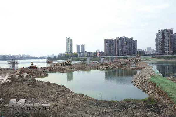 冬日的涪江上,寒風(fēng)吹拂,江水泛起道道漣漪。但金外灘跨涪江人行橋建設(shè)項(xiàng)目施工現(xiàn)場卻一派熱火朝天的景象:一輛輛滿載沙石的大卡車來回穿梭,一臺臺挖掘機(jī)舞動機(jī)械臂清理淤泥、安放涵管……