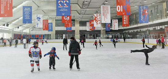 2月9日,孩子們在朝陽大悅城的冰雪運(yùn)動(dòng)館體驗(yàn)和學(xué)習(xí)滑冰、冰球等冰上運(yùn)動(dòng)。新華社記者李欣攝