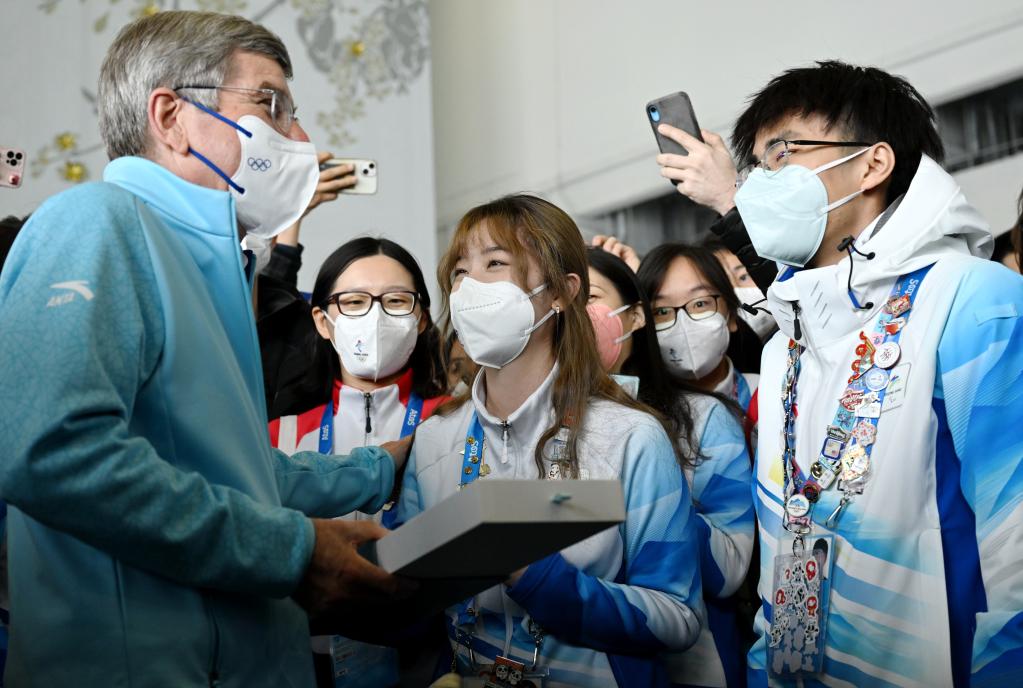 2月18日,國際奧委會主席巴赫來到北京2022年冬奧會主媒體中心,與志愿者交流互動。新華社記者李一博攝