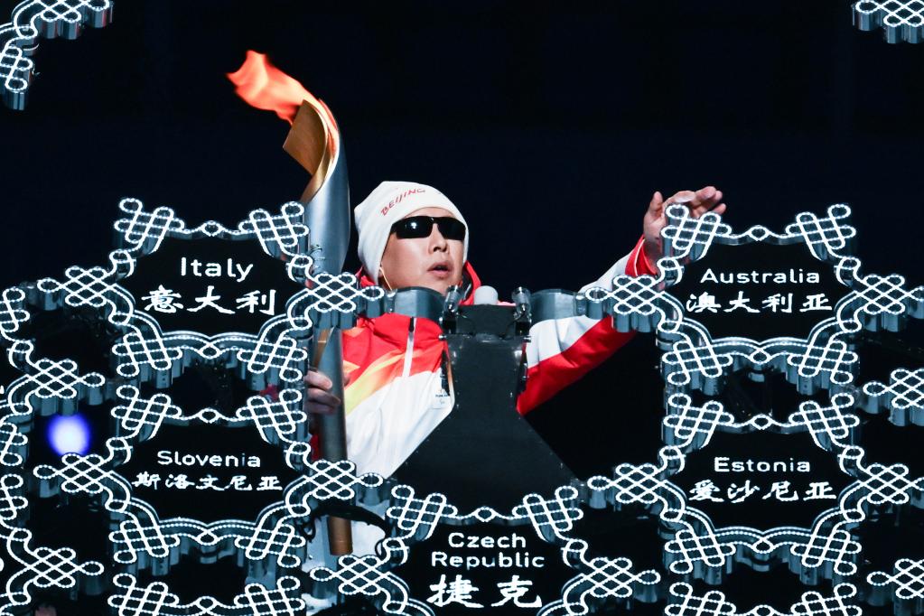 最后一棒火炬手、盲人運(yùn)動(dòng)員李端一步步走向“大雪花”造型的主火炬臺(tái),用他最有溫度的感官能力——觸摸,輕撫一片片小雪花?,F(xiàn)場(chǎng)安靜下來(lái),觀眾仿佛能感受到他在觸摸世界,認(rèn)知世界。幾經(jīng)摸索,火炬終于插入主火炬臺(tái)。一簇微光,燭照世界。
