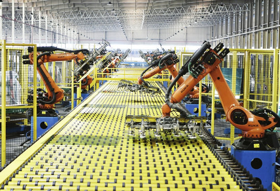 如今,我國已轉(zhuǎn)向高質(zhì)量發(fā)展階段,科技創(chuàng)新已經(jīng)成為建設(shè)創(chuàng)新型國家的關(guān)鍵要素和依靠力量。站在新的歷史起點(diǎn)上,我們要堅(jiān)定創(chuàng)新自信,努力實(shí)現(xiàn)高水平科技自立自強(qiáng),以一往無前的奮進(jìn)姿態(tài),向著科技強(qiáng)國建設(shè)的目標(biāo)闊步前進(jìn)。圖為在福建省福清市的福耀玻璃集團(tuán)汽車玻璃生產(chǎn)車間,機(jī)械手在生產(chǎn)線上作業(yè)。(據(jù)新華社)