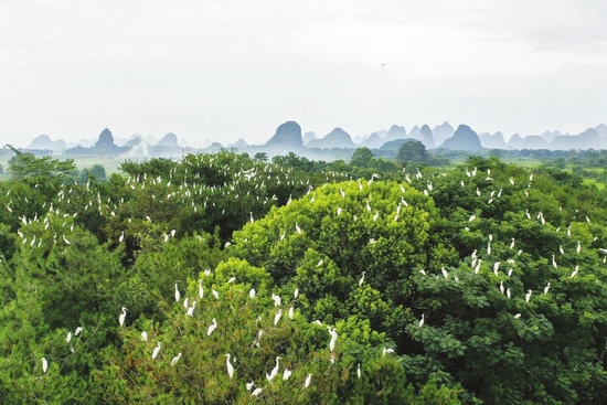 2022年全國兩會期間,代表委員們圍繞持續(xù)改善生態(tài)環(huán)境,推動綠色低碳發(fā)展建言獻策,為建設(shè)美麗中國貢獻智慧力量。圖為鷺鳥在廣西桂林市臨桂區(qū)四塘鎮(zhèn)王家村棲息。