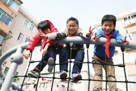 圖為在上海市徐匯區(qū)凌云街道凌云新村社區(qū),放假的孩子們?cè)谝黄鹜嫠!?/p>