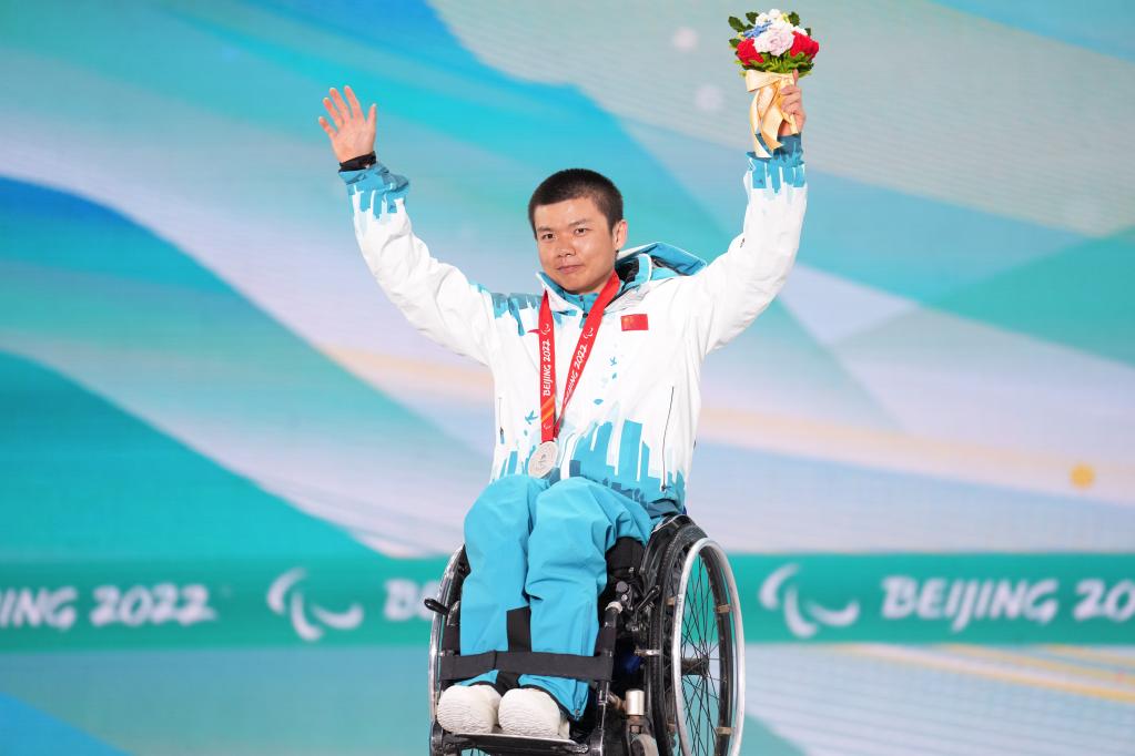 3月12日,亞軍中國選手鄭鵬在頒獎儀式上。當(dāng)日,北京2022年冬殘奧會殘奧越野滑雪男子中距離(坐姿)頒獎儀式在張家口頒獎廣場舉行。新華社記者 彭子洋 攝