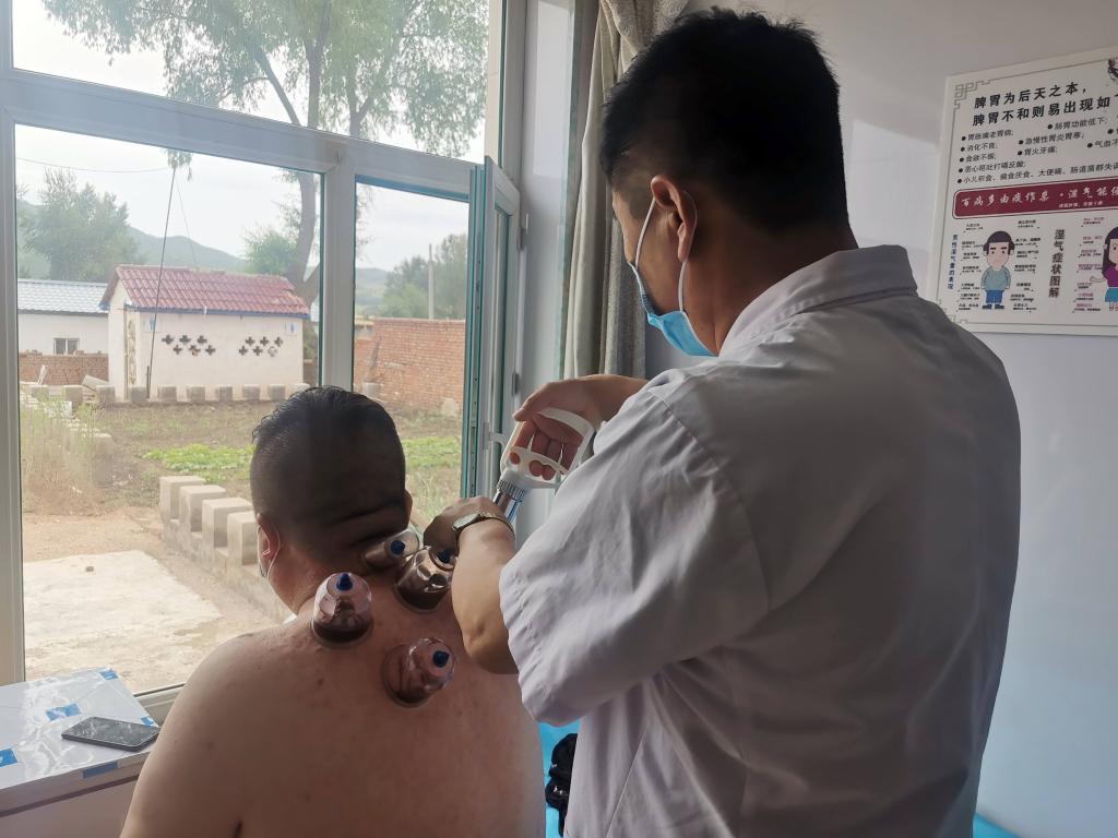 突泉縣寶石鎮(zhèn)寶龍村衛(wèi)生室村醫(yī)李朝輝(右)為村民進行拔罐治療。新華社記者 魏婧宇 攝