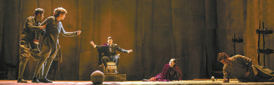 “洛桑,你撂門(mén)簾的時(shí)候,最好撂在你身后三分之二處的……”“這個(gè)地方我還要再改改……”3月15日晚上7點(diǎn)多,首都劇場(chǎng)前廳,濮存昕匆匆結(jié)束一場(chǎng)集體采訪,折身回到劇場(chǎng),開(kāi)始在舞臺(tái)上為西藏自治區(qū)話劇團(tuán)青年藏族演員合成漢藏雙語(yǔ)版《哈姆雷特》。為這部17日至19日在首都劇場(chǎng)上演的大戲做最后的打磨。