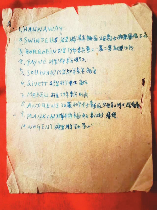 這是用白雪和紅血浸寫的一本日記。2022年清明前夕,我無意中翻出了已故哥哥伍丕治以前寄給我的數(shù)十封信和一本日記。日記本是藍(lán)色的布面封皮,歷經(jīng)70多年,依舊保存完好。封皮的藍(lán)色早已褪去,但還能認(rèn)得是1949年前印制的日記本,本內(nèi)壓著兩張小字條,字條上寫有三組30個(gè)被俘美軍英軍名單。日記本正頁頁面上的字體顯得雋秀有力。有著259頁日記的頁面因年代久遠(yuǎn),字跡大部分都看不清了,僅有40個(gè)頁面還能認(rèn)出部分內(nèi)容。只要能看清的,我都細(xì)細(xì)地看,認(rèn)真品讀。沿著他日記上記載的時(shí)間和足跡,我追尋著志愿軍梁山部(五十軍戰(zhàn)時(shí)代號(hào))那支英雄部隊(duì)的足跡。仿佛看到他們打過三八線、消滅英軍皇家重坦克營、攻進(jìn)漢城、阻敵漢江,斃敵11000多名,活捉美軍英軍俘虜61名的情景。名單上那30個(gè)有名有姓、入伍前從事某種職業(yè)的美軍士兵和英軍士兵正是其中的一部分俘虜。