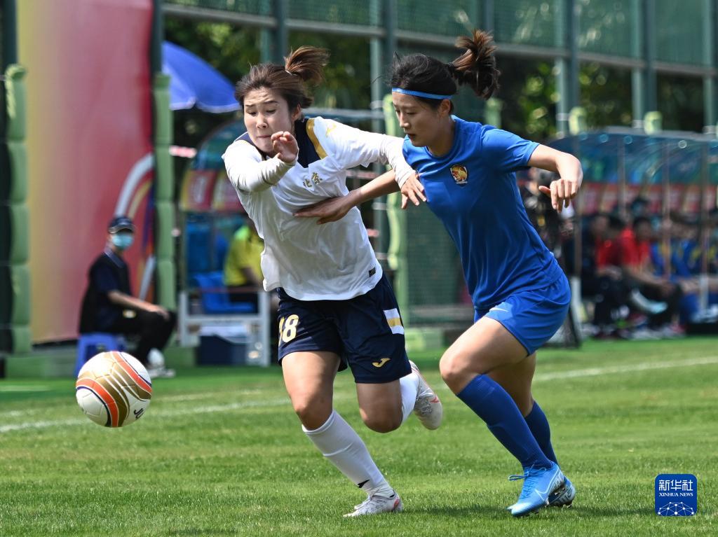 4月7日,北京女足隊球員張歆悅(左)與上海農(nóng)商銀行隊球員汪琳琳在比賽中拼搶。