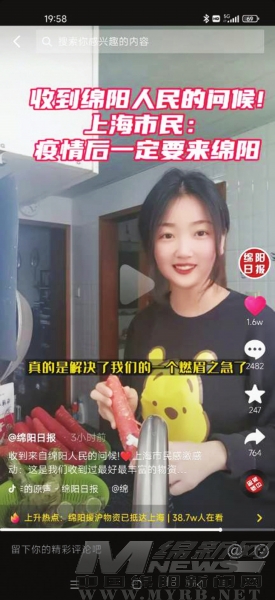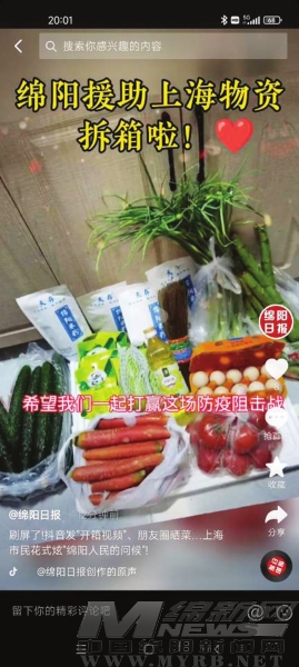 上海市民陸續(xù)收到“來自綿陽人民的問候”,整整一箱的物資讓大家激動不已,不少網(wǎng)友通過抖音、微博等平臺發(fā)布“開箱視頻”,曬出“禮包”,感謝綿陽人民的用心和關心。