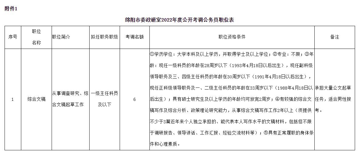 附件:1.綿陽(yáng)市委政研室2022年度公開考調(diào)公務(wù)員職位表