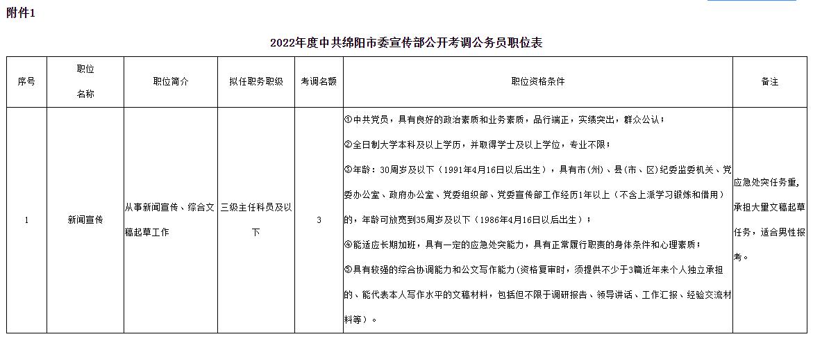 本次公開考調(diào)公務(wù)員3名,具體職位信息和要求詳見《2022年度中共綿陽市委宣傳部公開考調(diào)公務(wù)員職位表》(附件1)。