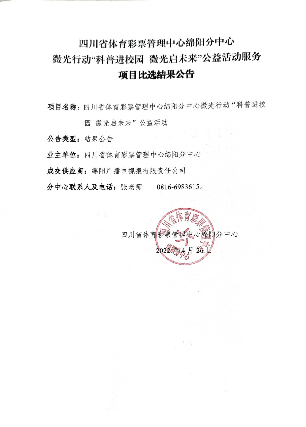 四川省體育彩票管理中心綿陽分中心微光行動“科普進(jìn)校園 微光啟未來”公益活動服務(wù)項目比選結(jié)果公告