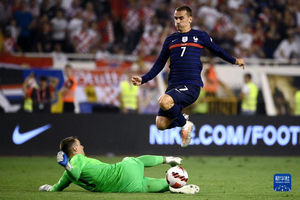 6月6日,法國隊(duì)球員格列茲曼(上)帶球突破克羅地亞隊(duì)守門員利瓦科維奇。新華社/法新