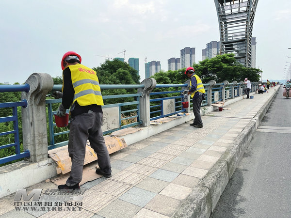 涪江五橋是江油市南一環(huán)連接涪江東西兩岸的重要橋梁設(shè)施,建成后一直受車流量大、重型貨車較多的影響,橋面出現(xiàn)不同程度的鋼護欄污損和行道伸縮縫蓋板銹蝕。江油城投建設(shè)工程有限公司涪江五橋項目負責人表示,“要在5天內(nèi)完成該橋的護欄清洗、路面修補以及綠化梳理,目前已經(jīng)安排了170名工人,后續(xù)還會繼續(xù)增加人員,提高施工效率。”