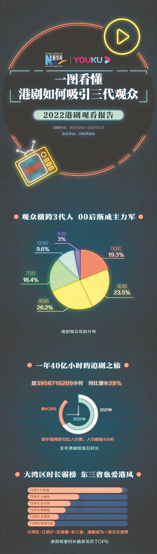 在內(nèi)地,港劇擁有一批忠實觀眾,且這批觀眾的規(guī)模仍在不斷擴大。今年6月,新華網(wǎng)聯(lián)合優(yōu)酷發(fā)布《2022港劇觀看報告》,有幾組數(shù)字頗值得關(guān)注。僅在優(yōu)酷港劇場這一平臺,觀眾在2021年觀看港劇的總時長就接近40億小時,同比增長28%;從劇集上來看,新劇比老劇更吸引觀眾——位居播放時長前三位的均是2021年新劇,分別是《逆天奇案》《伙記辦大事》和《刑偵日記》;地域上,廣東的觀看時長位居第一,上海與北京分別位列第二和第五,東北三省(遼寧、吉林、黑龍江)均躋身前六。從大灣區(qū)到大東北,港劇文化輻射全中國。