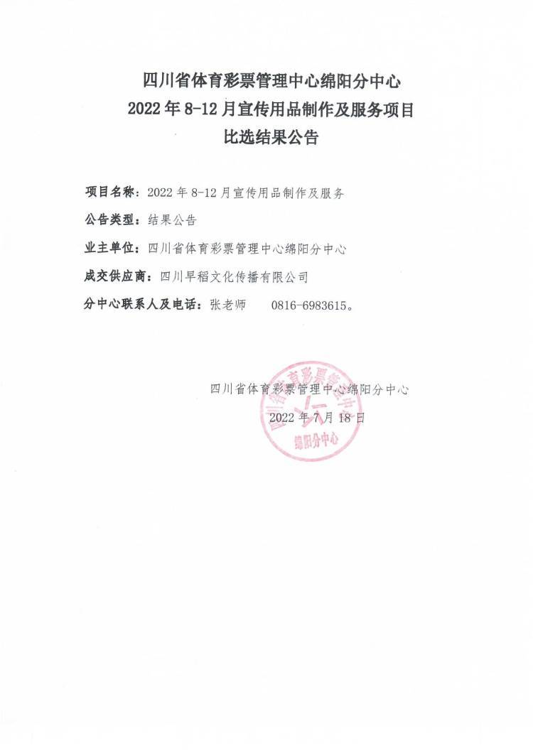 四川省體育彩票管理中心綿陽分中心2022年8-12月宣傳用品制作及服務(wù)項目比選結(jié)果公告