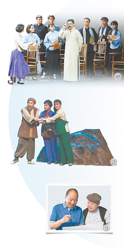 圖③:創(chuàng)作《天下歸心》過程中,朱紹玉(左)和京劇表演藝術(shù)家尚長榮說唱腔。