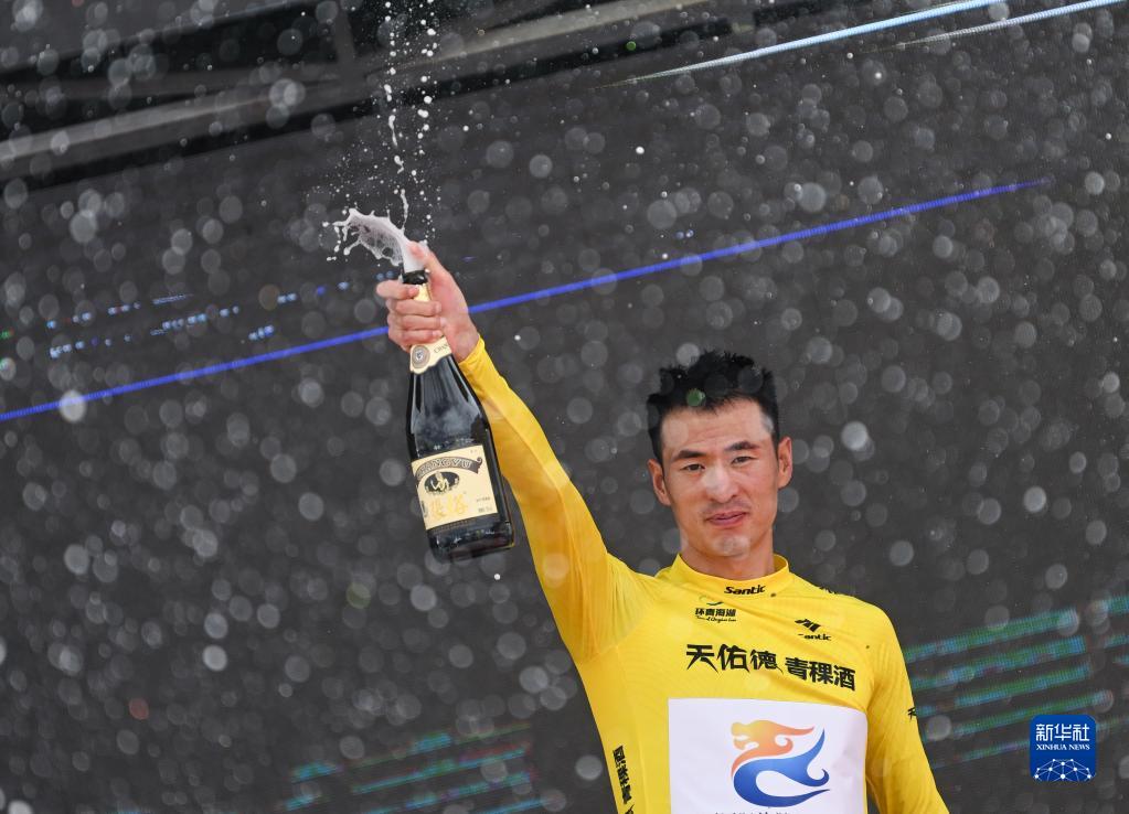 7月31日,平潭國際旅游島洲際隊選手劉建坤身著代表個人總成績第一名的黃色領騎衫在領獎臺上慶祝。