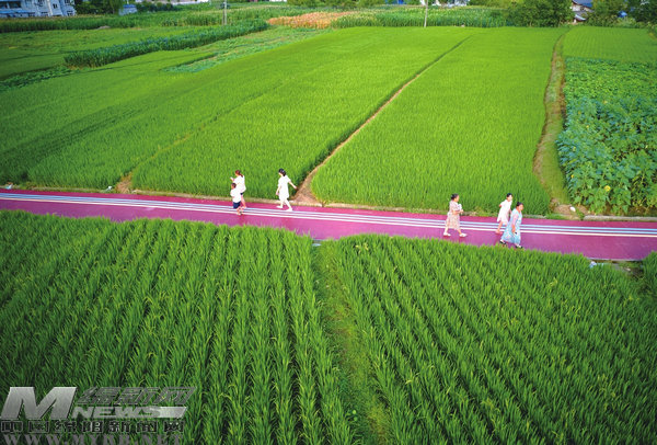 步入稻田,漫步綠道,四周青山連綿,耳邊蟲鳴鳥叫,蛙聲四起。黃昏時分,村民們走出家門,漫步綠道,在稻田間的休憩臺納涼拉家常,言談舉止間都能感受到鄉(xiāng)村振興帶給他們的幸福生活。