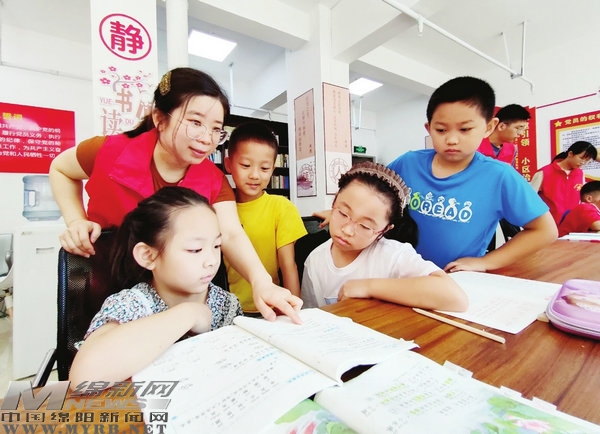 近日,在經(jīng)開區(qū)塘汛街道三江社區(qū)海賦長興小區(qū)黨支部內(nèi),“愛心暑期托管班”的孩子在志愿者的幫助下學習。(綿報融媒記者 陳冬冬 攝)