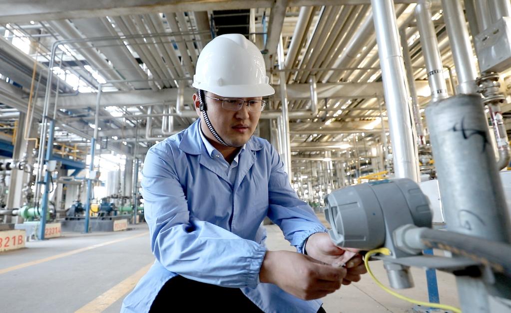 圖為陳亞鵬(右)與化工企業(yè)員工一起檢查生產(chǎn)設(shè)備。