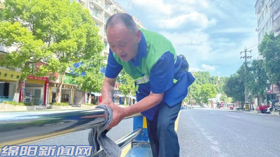 “秋老虎”天氣,炙熱、滾燙的街面令行人望而卻步。下午3時(shí)許,在鹽亭縣城紅光東路,環(huán)衛(wèi)工人杜松良正冒著烈日在清掃路面,擦拭欄桿。盡管額頭上滿(mǎn)是細(xì)密的汗珠,但他兩手的動(dòng)作仍舊干凈利落。