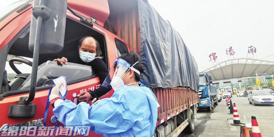 綿陽南高速出口,防疫人員對(duì)來(返)綿車輛和司乘人員進(jìn)行防疫檢查