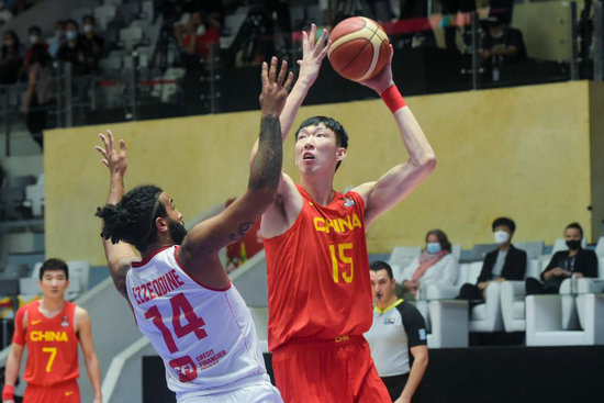 7月20日,中國(guó)隊(duì)球員周琦(右)在亞洲杯四分之一決賽中。新華社發(fā)(祖卡南攝)