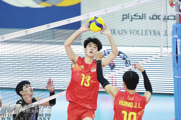 綿陽東辰學(xué)校學(xué)子周俊宇(中)在亞洲青年排球錦標賽中為進攻隊員傳球。
