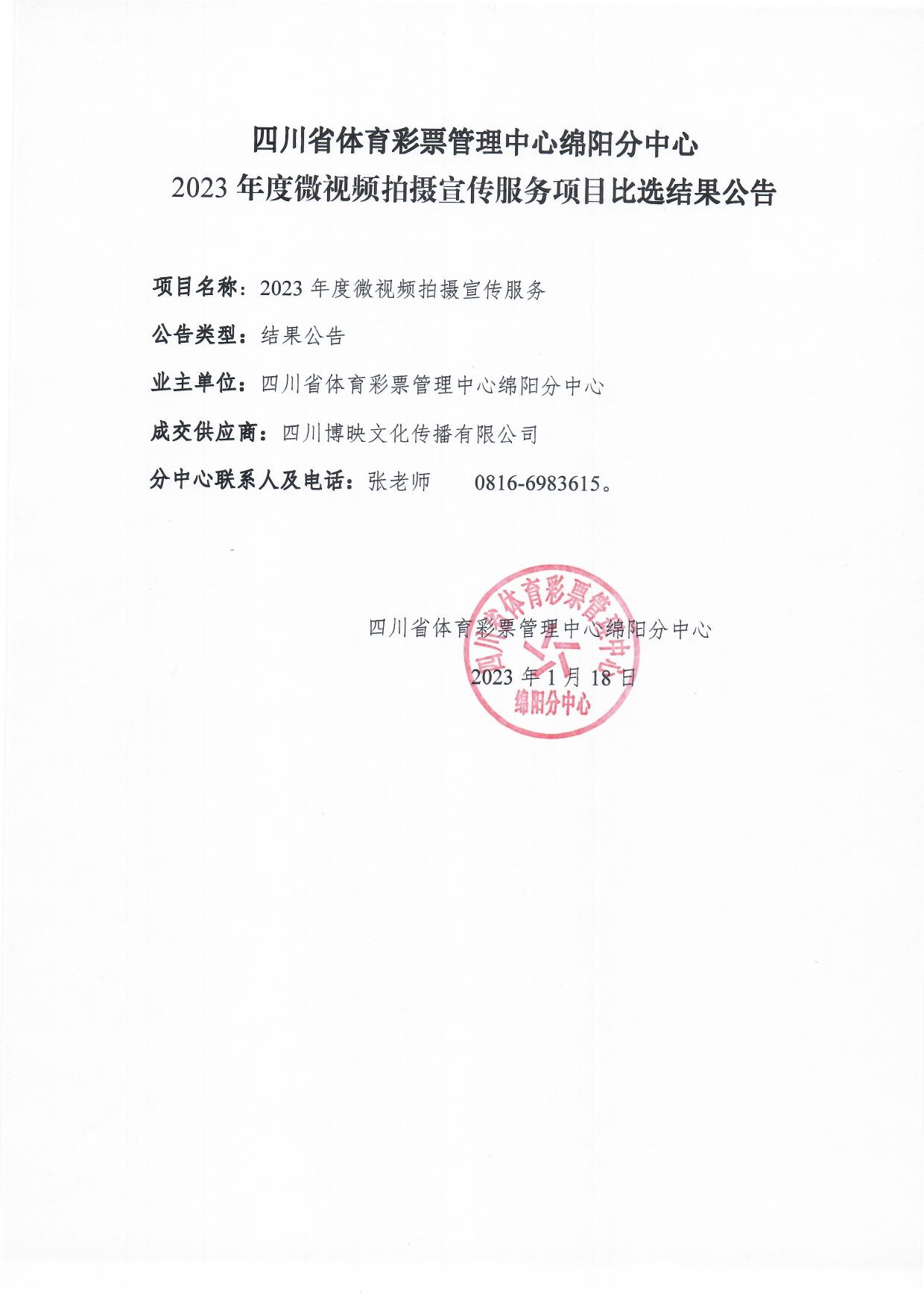 四川省體育彩票管理中心綿陽(yáng)分中心2023年度微視頻拍攝宣傳服務(wù)項(xiàng)目比選結(jié)果公告
