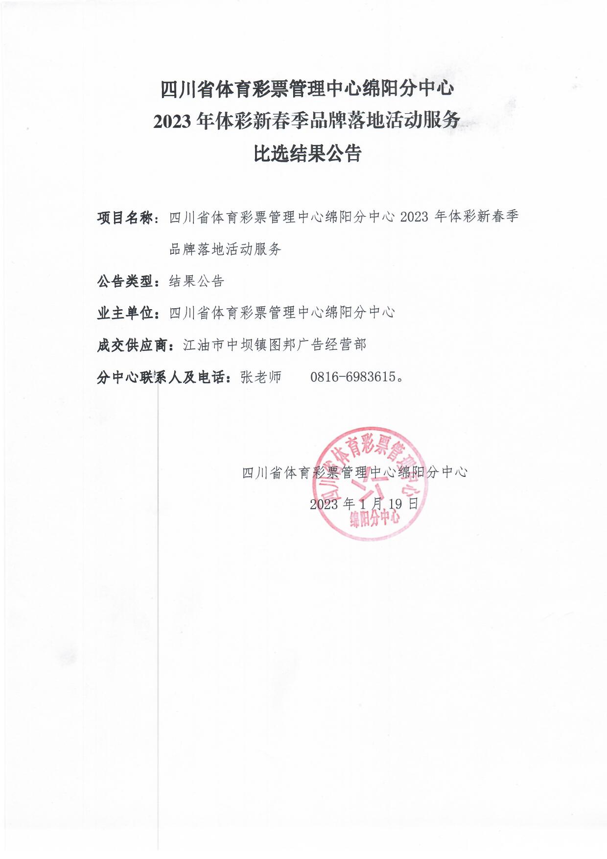四川省體育彩票管理中心綿陽分中心2023年體彩新春季品牌落地活動服務(wù)比選結(jié)果公告