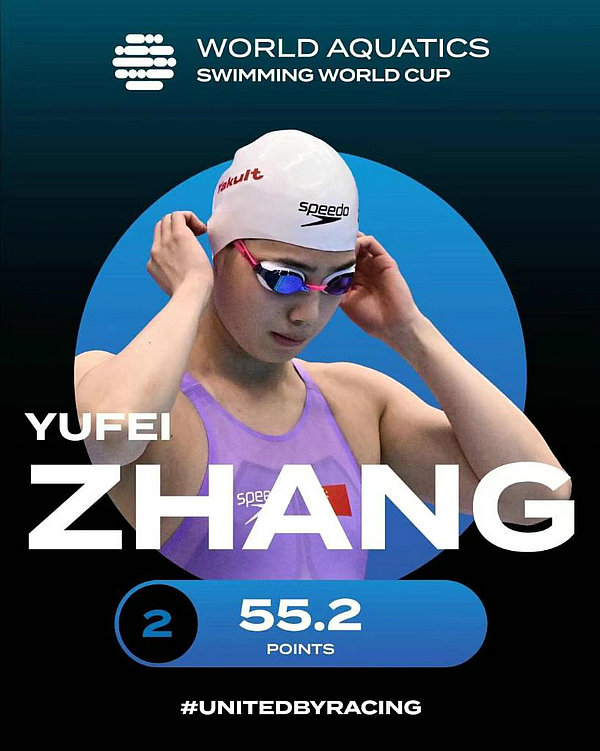 何詩(shī)蓓則以52秒02的成績(jī)改寫(xiě)她9月底在杭州亞運(yùn)會(huì)創(chuàng)造的女子100米自由泳亞洲紀(jì)錄52秒17,成為該項(xiàng)目歷史上第三快的選手,她還收獲了200米自由泳金牌和400米自由泳銅牌,在積分榜列第三名。