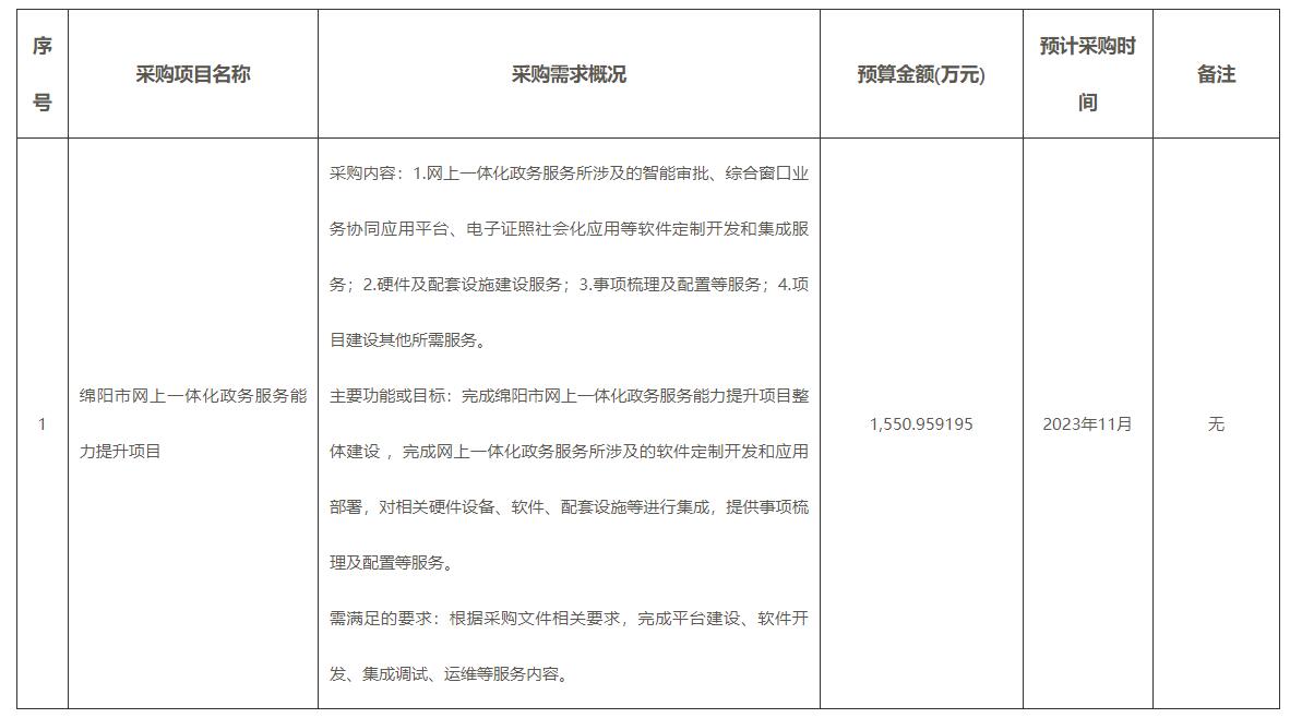 為便于供應商及時了解政府采購信息,根據(jù)《四川省財政廳關于開展政府采購意向公開工作的通知》(川財采〔2021〕153號)要求,現(xiàn)將綿陽市政務服務監(jiān)督管理局2023年度(第4批)采購意向公開如下: